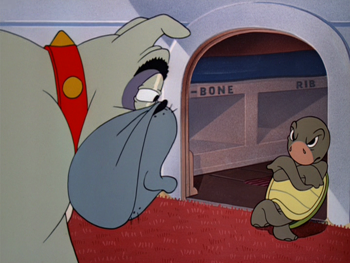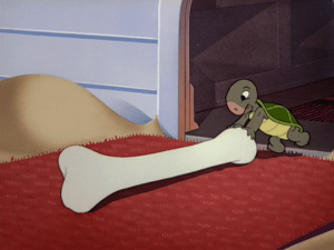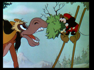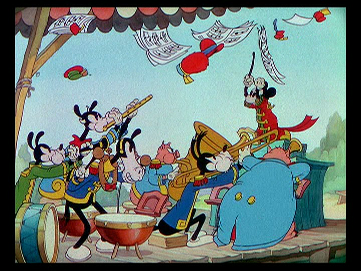 As Mickey finally gets the orchestra back on track, the bee returns and buzzes around Mickey, and each move the mouse makes to swat it away is interpreted by the orchestra as his direction with comical results. The bee buzzes around Horace Horsecollar, playing percussion, who tries to swat him with the cymbals, only to crash around Goofy’s head.
