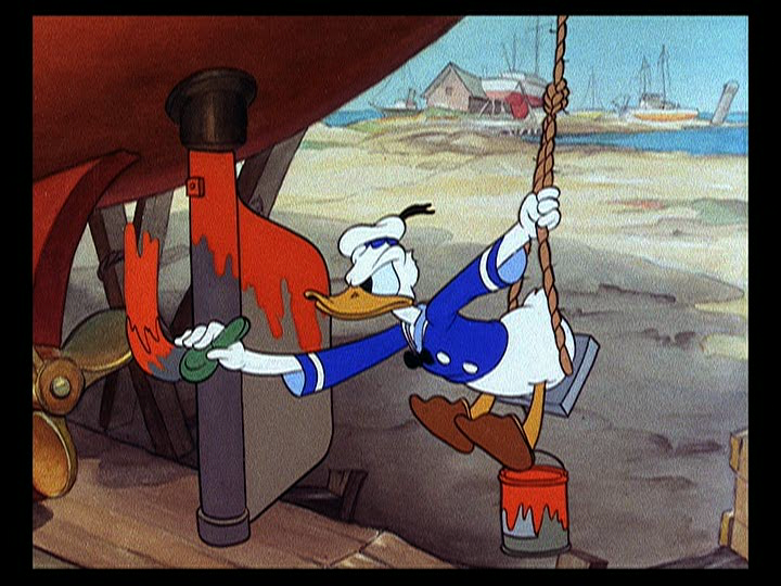 Donald grabs one of the flutes from the shake down and begins his takeover attempt again, not noticing a bee buzzing around him curiously. The bee flies into the flute, and ends up in Donald’s mouth, causing the duck to have another fit. When the bee flies away and lands on Mickey’s hat, Donald grabs an ice cream cone and throws it in the insect’s direction. The ice cream lands in a trumpet, and the trumpeter blows it out, which hits Mickey on the back of the head. As Mickey tries to shake the ice cream out, directing the orchestra along the way, the classical piece gets a somewhat interesting interpretation, and Mickey’s temper flares again.