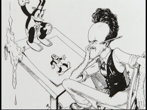 A caricature of Ub Iwerks and his creation, Flip the Frog