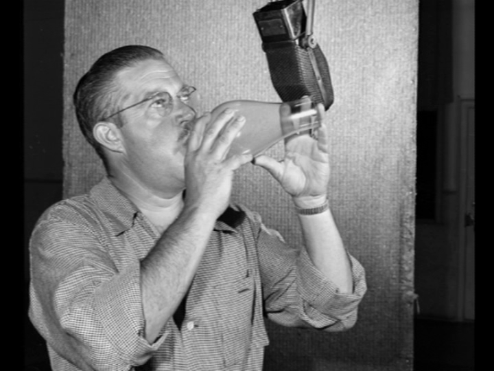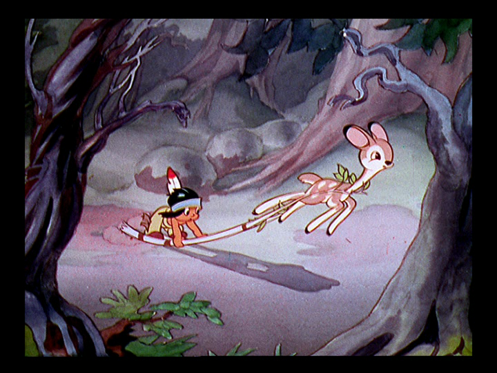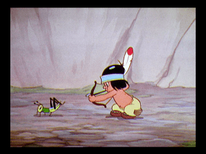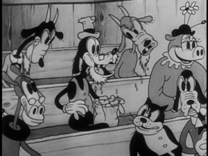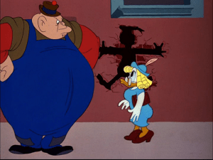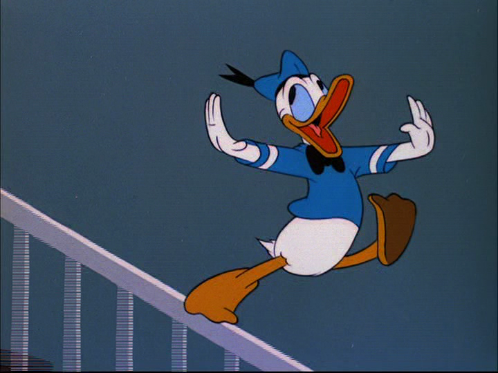 As a last ditch effort, Donald walks by, dressed as a woman, hoping the man will lift his hat in a polite greeting. He does so, and as the pill bounces away, Donald quickly slips down the street and races after the pill as he turns the corner. The pill bounces into a farmyard labeled “no trespassing,” and Donald watches in horror as it slips into a cow’s open mouth. The duck bursts into the fenced in yard and starts screaming at the cow, when the cow, now with the voice of Ronald Coleman, tells him to shut up and that the sign says “no trespassing.” As Donald tries to get the pill back, the cow informs him that he can’t understand a word the duck says, causing Donald to fly into a rage.