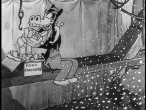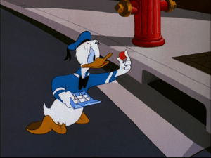 Donald is next seen looking rather defeated at Daisy’s house, but she insists that he not give up, as she has faith in him. She kisses him and encourages him to try again, and Donald excitedly cartwheels out of the house, determined once more to try. Again, much to Donald’s dismay, he is misunderstood and sent packing by the owner of the house. Humiliated and angry, Donald continues to walk the city streets, until he passes a peddler selling “voice pills” for only 10 cents. Donald doesn’t believe it, but is willing to try anything once, so he buys a box.