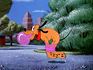 When the bell sounds for lunch, the student stampede outside, making a mess of the playground. Goofy hears a group of his students whispering, and when he goes over to hear their conversation, he blushes at the obscene nature of the joke. The students return from lunch as if they were forcibly marched, and Goofy has to drag George inside. When the spelling lesson begins, Goofy asks George to spell the word “cat.” George attempts to cheat off his neighbor’s paper, but when the student pulls it away, George pulls a squirt gun on him. The student misspelled the word on purpose, so George ends up squirting the student in the face.