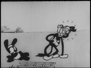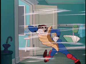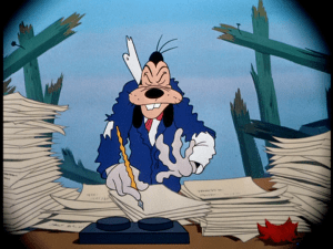 George continues to cause mischief in the classroom, and finally sets the clock ahead an hour to 3 o’clock, when the bell rings and the students take off like a shot. Goofy is left to clean up the students’ mess, and have a parent-teacher conference. In this conference, the parent grabs Goofy by his collar and demands to know “What’s the matter with my kid’s grammar?” before punching Goofy on the head. As the short draws to a close, the school building suddenly explodes, and we see “I will not bomb the school again” written several times on the chalkboard by George, still using the squeaking chalk.