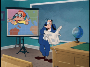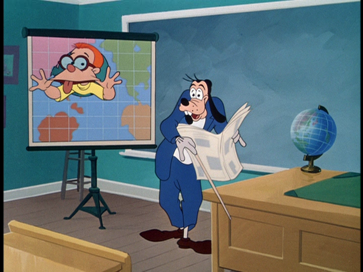 Goofy then calls for homework, and the students begin to place apples on the teacher’s desk. One apple seems to be missing, and when Goofy wonders who is absent, he looks over to see George at his place in the corner, eating his apple. George then begins to run the chalk down the chalkboard, making an annoying squeaking sound. Goofy cuts him off before the geography lesson, and pulls down the map. While he tries to give the geography lesson, the students have their books propped up, but are playing with various toys behind them. George then cuts a hole in the map, making faces at his fellow students.