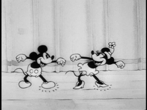 The curtain opens on a grand stage to reveal Mickey playing a piece on the piano. He soon switches genres of music from classical to jazz, and begins playing around with the piano keys. Minnie enters stage left and begins to walk in time to the music before singing “Saint Louis Blues” rather dramatically. Mickey finds gum under the piano and gets his fingers stuck to it, which causes him some difficulty playing Minnie’s song.