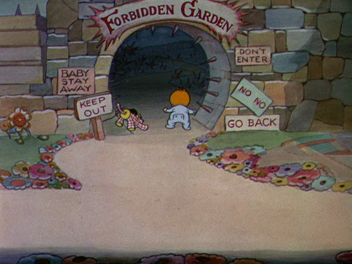 When the baby and dog follow the parade, the baby notices an area called the “Forbidden Garden,” marked with signs warning him to stay away. Intrigued, the baby wanders in with the dog close at his side. The garden is filled with dangerous objects for a baby, like corkscrews and fountain pens with ink. The dangerous items come to life and begin fighting each other. The baby grabs a hammer and destroys a tree made of pocket watches. The baby then accidentally lights a box of matches and the lit matches chase the baby around the garden.