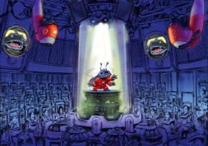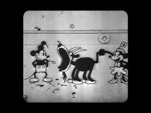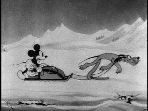 Once Donald leaves, the two get to work gathering some of Dolores’ peanuts. The elephant is alarmed at their thievery, but sets to work getting her peanuts back. The two can only watch as she uses her trunk to deplete their supply from the tree. As Chip and Dale retaliate, hitting her with a tree branch, Dolores runs to Donald for help. Donald chases after them, but knocks himself unconscious in the process. After Dolores revives Donald, he spies the pair tap dancing, “working for peanuts” as one customer puts it. The chase begins again, with the chipmunks knocking over a bucket of white paint. Seeing Dale drenched in the paint gives Chip an idea.