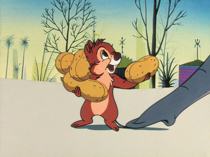 There’s a knock at the door of the zoo, which Donald opens to reveal a package that contains “genuine albino chipmunks.” The instructions for the creatures include to “feed only select grade A peanuts (and humor them).” Donald is excited about the find, and gives them a special place to stay. Dolores provides them with a swimming pool, and without thinking, Dale rushes in, losing the paint from his bottom half before Chip is able to pull him from the water. However, they fool Donald and Dolores into thinking Dale is only wearing suspenders, and remain at the zoo, happy and provided with all the peanuts they could ever want.