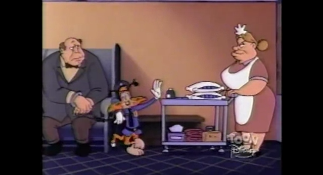 The mob couple, Helga and Mr. Blaine, come up with a plan to use knock out gas and truth serum to get the jewel information. Unfortunately, the knock out gas knocks out Stiff Lips rather than Bonkers, and Bonkers attempts to arrest Helga, although he is chained to Stiff Lips and unable to leave. Miranda searches for the mob while Bonkers tries to hide Stiff Lips, although Helga is hot on his trail. When Blaine finds that Bonkers knows where the jewels are buried, Blaine and Helga try and torture the information out of him. Bonkers is able to escape and tells Miranda what’s been going on. Bonkers tries to hide, but is found by Helga and Blaine. Helga tries to use the truth serum on Bonkers, but Miranda takes him away before he can reveal the secret of the jewels. Helga and Miranda end up battling on top of the train until Bonkers sprays her with the truth serum, where she reveals she wanted to act and dance, but is snapped out of it by Blaine.