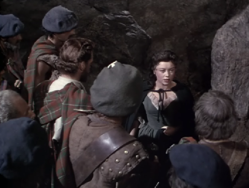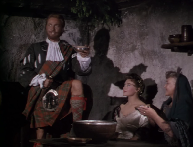 As Rob Roy is sent to England in Montrose’s carriage, MacGregor clansmen come to his rescue. Safely back home, he greets his mother, but warns her that the troubles are not quite over yet. He is shocked when she tells him that Argyll was the one that helped save him and that Argyll is not the enemy Rob Roy considers him to be. She asks him to try the ways of peace and settle down, and he hints at his affection for local girl Helen, although he has no intention of finding out her feelings for him. At the local tavern, where Helen is, the men are telling their stories from battle, when Helen animatedly picks up the story her father was telling. She’s hoping that Rob Roy will be by, and when he does appear, she acts rather indifferent at his arrival. He distracts her father to have a chance to talk with Helen alone (although he can only talk to her “alone” with her parents in the room). Finally, he proposes, and she happily accepts.