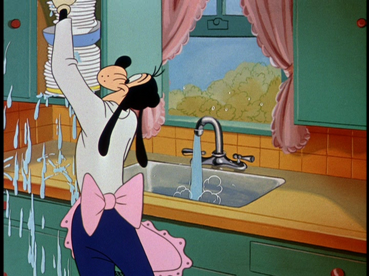 It’s another day in suburbia, and Goofy stands with his son, George, at the door of their house while his wife is preparing to head off in the car for the day. She asks if he’ll be able to handle everything while she’s away, and he scoffs at her question, thinking housework is easy. She leaves, although not without causing major damage on the way out. He starts with giving George breakfast, but spills George’s milk and gives him a rather strange haircut around the rim of his baseball cap. The doorbell buzzes, sounding the arrival of the milkman, who gives Goofy a kiss as he delivers the milk (not noticing that it is not Goofy’s wife), leaving Goofy stunned, although he brushes it off a being friendly. He then shoves the milk in the already overstuffed fridge, which causes the food to bulge out everywhere.