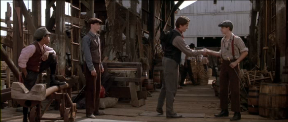The other newsies are sent out as ambassadors to gather the other newsies in the city, and Jack, Boots, and David head to Brooklyn to convince influential newsie Spot Conlon to join. Spot is not convinced that Jack’s newsies are going to follow through on their threat of strike, even though David claims that Spot is the key to creating a real newsboy union. When they prove that they won’t run at the first sign of danger, Spot may be convinced to join. The boys prove that they are in it for the long haul when they trash the distribution center, but at a price, as their friend, the crippled Crutchy, is taken by the Delancey Brothers and beaten, then taken to the Refuge. Jack and David head to the Refuge late at night to break Crutchy out, but Crutchy refuses to go, as his already injured leg is worse from the beating. When the newsies attempt to trash the distribution center again, members of the Irish Mob are there to greet them. Fortunately, Spot Conlon stays true to his word, with Spot and the Brooklyn newsies assisting Jack and his boys. The newsies have another victory in their strike, and Denton takes a picture after their triumph. Jack then decides that to get the attention of the other papers, the newsboys will have a rally with every newsboy across the city.