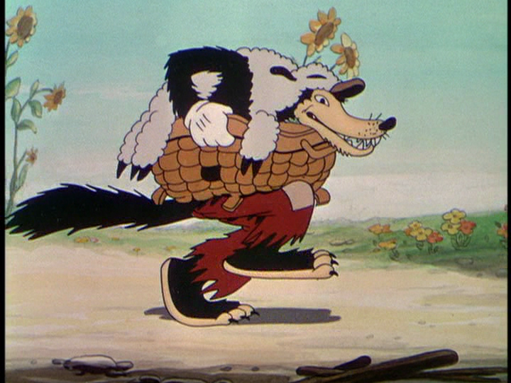The wolf appears at the door, pretending to be a lost little sheep that needs help, but the two see right through his disguise. Angered, he blows the house down, and the two flee as fast as they can to Practical’s house. He lectures the two of their folly, but tells them he’s glad they’re safe. The Wolf then arrives as a brush salesman, but Practical Pig doesn’t fall for it. The Wolf then attempts to blow the house down, but is unable to do so. He finally decides to come down the chimney and seize the pigs, unaware that Practical Pig has a large boiling cauldron waiting below filled with turpentine. The wolf falls in and is sent shooting up again from the pain, and scurries down the road, howling. All three pigs end the short singing merrily.