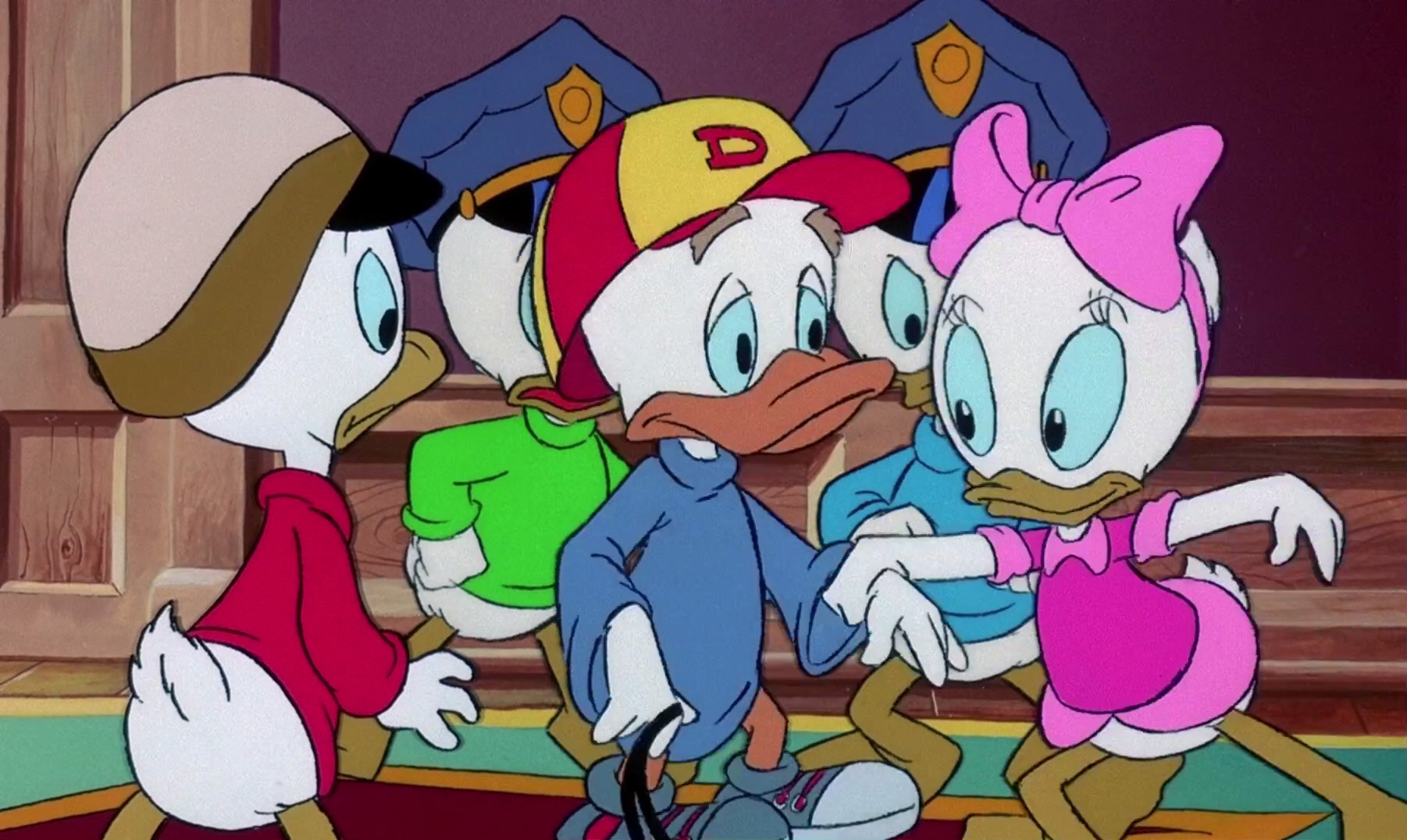 Back in Duckburg, Webby is polishing the lamp, when it starts to move. Huey then rubs the lamp, and a genie pops out. Although he’s at first confused as to where he is, he soon is grateful for the kids letting him out. The four kids are excited about their prospect of having three wishes each, with Webby making the first wish for a baby elephant as a pet. The genie is worried that by granting such a huge wish, people will know he exists and come to take him away. Their nanny, Mrs. Beakley, finds the elephant, and Huey begrudgingly wishes away the elephant before she can show Scrooge. The kids take genie to hide in their room, but he slips on a skateboard when Scrooge is lecturing the kids on teasing Mrs. Beakley; fortunately, he takes on the guise of a kid, with the kids naming him Gene. After Scrooge begrudgingly allows Gene to stay the night, the kids set to work on asking Gene for their wishes. Gene reveals to the kids his desire of wanting to be just like the kids, and his fear of his meanest master, Merlock. The kids tell Gene that Merlock has to be dead by now, but Gene reveals that Merlock’s first wish is to live forever. The biggest problem, he then explains, is that Merlock holds a magic talisman that, once placed on the lamp, allows the wearer unlimited wishes. The kids reassure Gene that Merlock has no idea that Gene is with them before going to sleep.