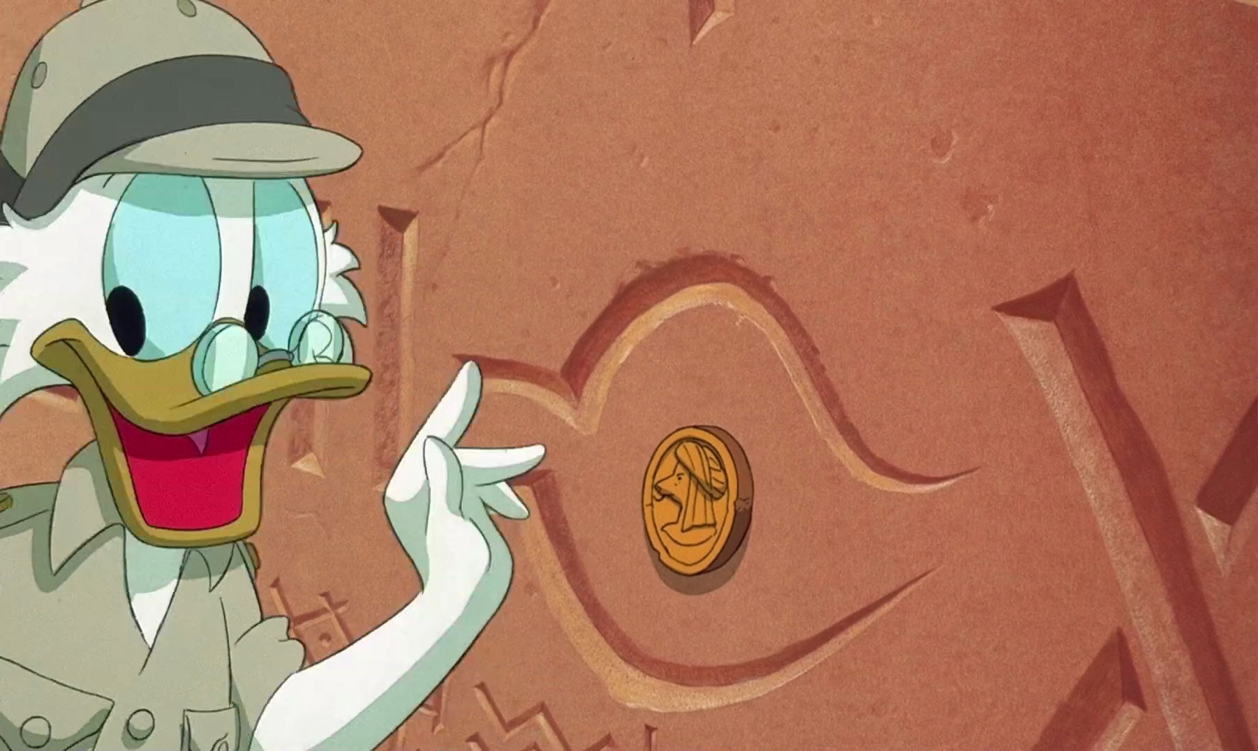 After digging up the secret pyramid where the treasure is located, the group goes inside to explore, and end up falling down a trap door. As they do, they find the location of the treasure, and excitedly leap across a rope bridge to get to it. Webby finds a lamp, and asks if she can keep it as part of her tea set. Scrooge agrees, and Dijon makes off with the rest of the treasure, joined by Merlock, who destroys the rope bridge before Scrooge and the gang are able to make their way back across. Seeing several large scorpions waiting below, the nephews and Launchpad come up with a quick plan to get out alive. Outside, Merlock is digging thought the treasure, unable to find the lamp. Believing that Scrooge has it, Merlock turns into a large bird and searches for Scrooge. After escaping the pyramid, Scrooge is depressed, as he has lost the treasure he’d been searching for forty years. Webby offers the lamp, but Scrooge allows her to keep it. Merlock is unable to find Scrooge, and demands that Dijon finds Scrooge and retrieves the lamp.