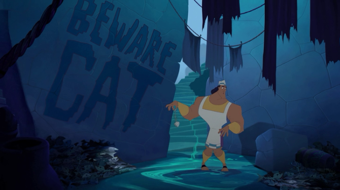 The film begins with a cheese explosion at Mudka’s Meat Hut, where Kronk is the head chef. Kronk is distressed, as his perfect life seems to have gone awry. He takes the audience back to when his troubles started – earlier that same day. Kronk has changed a lot since the end of his involvement with Yzma, with the whole town adoring him. Kuzco interrupts Kronk’s narration to talk about himself, but explains that the film really belongs to Kronk, but still interrupts here and there. Back at the Meat Hut, Kronk continues his duties as head chef and head delivery boy, and sees his friend Pacha and his family. Soon, an urgent message arrives for Kronk, which he attempts to hide from everyone. He is panicked that his father is coming for a visit, as he hasn’t told his father that he doesn’t have a wife, family, and a house on a hill. His father never approved of his cooking talents, and Kronk feels like he always disappointed his father.