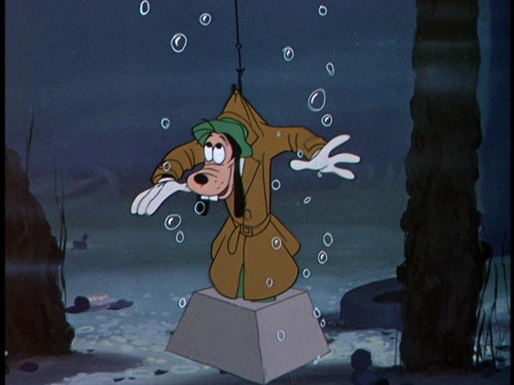 The short begins with a city at night, with several crimes being committed in one building. One small spot at the top of the building has an “Office to Let” sign, which is soon taken away and replaced with a sign for Johnny Eyeball, Private Eye. Johnny (portrayed by Goofy), has his reading of a Mickey Mouse comic interrupted by a mysterious woman who requests him to “find Al.” She pays him $100, and the police chief appears, telling Johnny to leave the case to the police. A shady weasel approaches Johnny with a gun soon after, and threatens him. Johnny then heads to Al’s Joint, disguised as an old man, but is quickly recognized.