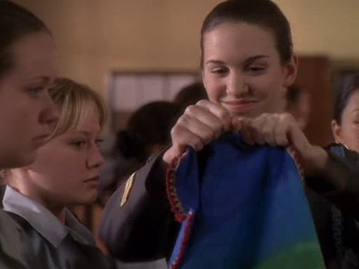 Back at the dorms, Stone retaliates against Kelly’s antics by stealing her blanket and tearing it up. Kelly tries not to cry, but decides to take revenge instead. Taking her new art kit, she enters Stone’s room while she sleeps and paints her hair to match the tie-dye design of the blanket. The cadets laugh the next morning, and Stone is mortified. She then hands Kelly a court martial summons, and it is later revealed that Joe will be the one to review the verdict and dole out the punishment. Joe thinks that Kelly and her antics are going to blow his career. Kelly overhears this, and is crushed. When her mother admits that maybe they shouldn’t have come to the academy, Kelly tearfully says that they never even asked her. At the court martial, they find Kelly guilty, and Joe gives her the punishment of being the equipment manager of the drill team. She starts off by polishing the drill team’s shoes, and has a chance encounter with Brad, who teaches her how to shine shoes, and then tells her that she makes him laugh. Reinvigorated, she continues to work hard at polishing. The team hopes to win Regionals this year, as they haven’t done well since their third place win in the 1970s. Kelly develops a respect for the drill team. Carla offers to help Kelly with the polishing, and the two become closer after Carla admits that her home life isn’t that great. While polishing, Kelly starts playing around with one of the rifles, quickly picking up on what to do.