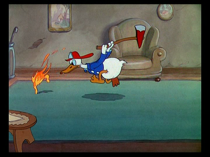 Donald chases after a flame with his axe and ends up doing more damage to the house than the flames. Goofy chucks as much furniture as he can out the window, unaware that he is throwing it straight into the fire wagon’s boiler. One table with collapsible sides flies out the window and flies right back in, knocking Goofy against the wall. Meanwhile, Donald gets the idea to trap the flames with flypaper, which works, but then the flames band together to attack Donald with the water bucket. Mickey ends up falling down the chimney, crashing into the fireplace Goofy and Donald are holding. They hear Clarabelle Cow singing upstairs, unware of any fire, and decide to go rescue her. When she sees them, she throws her scrubbing brush at them, thinking that they’re just being fresh. They manage to cart her out, although she accuses them of being kidnappers and keeps screaming for the police. She manages to slide her way down the ground, while the boys land in the bathtub, and are continuously beaten by Clarabelle and her scrub brush.