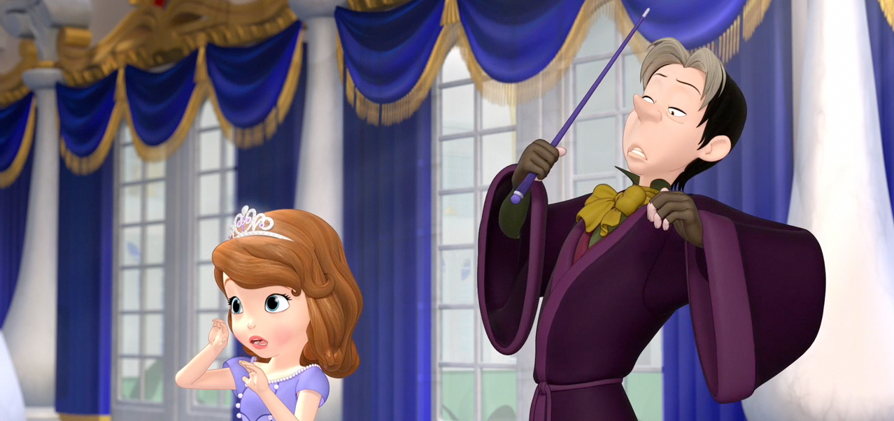 Sofia arrives home, exhausted, and is cheered up when she sees her friends Jade and Ruby waiting for her in the garden. While attempting to pour tea, James comes over and assists her as his way of apologizing for the prank. He offers to help train her for the ball, and Sofia accepts. Amber is strolling through the garden and overhears Sofia admitting she can’t dance, and gets a wicked idea in her head on how to embarrass Sofia. The next day at dance class, Sophia is given a special pair of shoes to wear by Amber, and when she dances with the teacher, the shoes start acting up, making Sofia jump around the room like crazy. She realizes that Amber has tricked her, and after she is able to get the shoes off, she heads to the carriage, upset. She goes to see Cedric before the ball, asking for a spell to make her a better dancer. He gives her a spell to say when the waltz starts, but he gives her a spell to put everyone to sleep, and will only reverse the spell if Sofia gives him the amulet. Before the ball begins, James confronts Amber, angry at his sister’s actions, and is hurt when he tells her that everyone likes Sofia more than they like her, especially after her horrible actions.