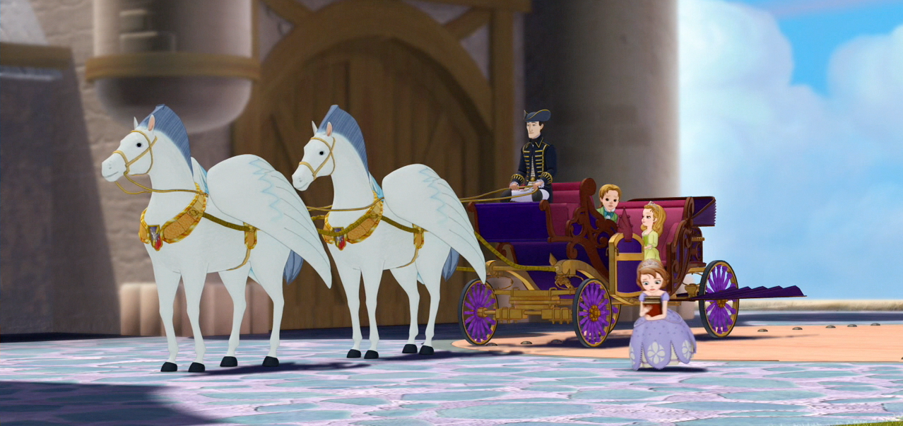 After school, Sofia rushes inside without a word to her siblings, although James wants to apologize. Sofia runs into Cedric again, who offers to give her a private tour of his lair, and she accepts. She discovers the book he has about her amulet, and he explains the powers of the amulet: “with each deed performed for better or worse, a power is granted – a blessing, or a curse.” He tries to take the amulet for her, but she remembers her promise to never take off the amulet, and is quickly shown out. The next morning, the animals wake her up again, and she can hear what the animals are saying. The rabbit, named Clover, explains that the animals always help the princesses, but all they want is a little bit of food for their trouble. Sofia prepares the animals a basket of food, and they set up a picnic outside. Soon, she has to go to school, but Clover reminds her to keep her eye on the ball – the royal ball. She is cheered by his pep talk, and heads to school with renewed enthusiasm. After making several mistakes, she soon masters the skills, and makes several new friends.