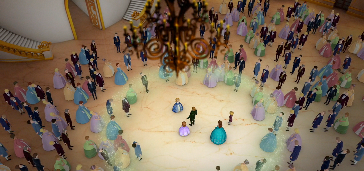 Sofia attends the ball and is greeted by Roland, who takes her to the floor for the first dance. Sofia recites the spell, and is shocked when everyone falls asleep. Cedric, excited that his spell worked, didn’t count on the spell working on him as well, and falls to the floor in a sound slumber. Sofia frantically runs around the castle looking for help, and a tear lands on the amulet. She turns around to find Cinderella there waiting to help her. Cinderella can’t undo the spell, but can help her find her way. Cinderella relates her only regret: not making amends with her step-sisters. After her story, she takes her to see Amber, and convinces Sofia to give Amber a second chance. She takes Amber to the ballroom, and explains what happened. Amber apologizes for her prank which caused Sofia to get a spell, and the two make amends, with Amber calling Sofia her sister for the first time. The two head to Cedric’s lair to find a counter-spell, with some assistance from Clover and the other animals. Amber and Sofia find the counter-spell book, and before they wake everyone, Amber helps teach Sofia how to dance. After reciting the counter-spell, Sofia has her first dance with Roland, which goes off successfully, except that Roland admits that he can’t dance very well. During the dance, the whole family dances together, and all is well.