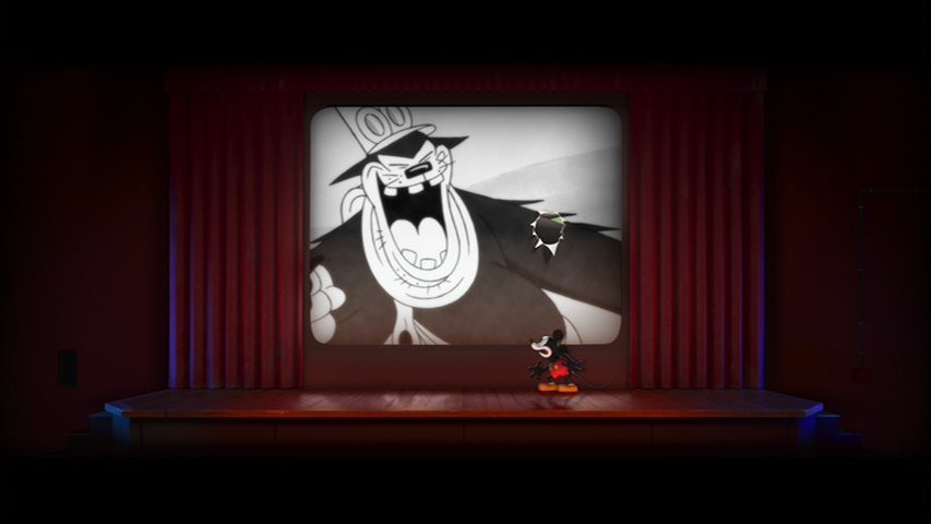 Mickey is shocked about how he looks in the real world, including the red of his shorts, but soon forgets that when he realizes Minnie is in trouble. Try as he might, he has no way of saving her from his position. Suddenly, Horace appears, thoroughly assimilated into the real world (and wearing a Captain America shirt to boot). Mickey calls Horace to attention, and turns him into a makeshift plane, using Milk Duds as bullets to shoot at Pete. The plan, doesn’t work, however, so they try another approach: calling Pete’s phone and spraying him with the contents of a fire extinguisher, turning the animated scene into a winter wonderland. Pete then falls through the ice and lands in a lake, which threatens to flood the theater. Mickey pokes holes in the screen, freeing Minnie and pulling everyone out of the film with them. A chance ensues in and out of the animated and real world, and Mickey is knocked unconscious while Minnie is captured again. After reviving Mickey, the gang then realizes they can manipulate the situation by flipping the screen up and down and back and forth, and Pete is soon injured to the point of unconsciousness. Minnie is saved, and the screen is broken, sending Pete into the real world. The gang then closes the screen, leaving Pete trapped in-between worlds as he tries to get back.