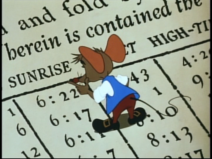 The short begins with a group of schoolchildren being taken to the statue of Benjamin Franklin to hear of all the amazing things he did. At the same time, a group of schoolmice are taken to the statue of a mouse on top of Ben’s head, who actually is the one who had all the great ideas for which Ben is credited. The tour guide for the mice holds up a book of Amos’ memoirs, and the story begins with Amos’ meager upbringing as a church mouse. He decides to leave his parents and 26 brothers and sisters to seek his fortune, and sets out into the winter storm. He tries to look for work, but is unable to find anything due to his being a mouse. By nightfall, he takes refuge in a run-down store run by a Benjamin Franklin, printer and bookbinder. He comes across Ben, who sneezes hard enough to break his glasses. Ben is also being chased by debt collectors, and is given 24 hours to come up with the money, or else. Amos gives Ben the idea of creating a stove in the middle of the room, so he can provide the room with more heat. While Ben works on the stove, Amos creates a pair of bifocals for Ben to wear from his two broken pairs of glasses.