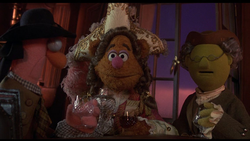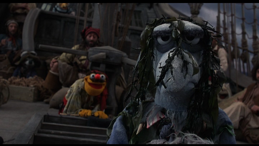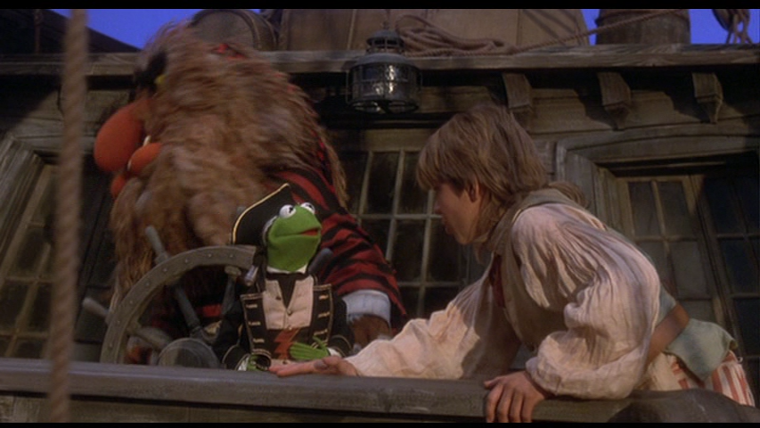 Jim manages to sneak back onto the Hispaniola and save the officers, and they use the pirates’ superstition against them, as they have Mr. Arrow pretend to be a ghost to scare them all off the ship. Jim then commands the ship and they head to the island to rescue Smollett. The pirates hang Smollett by his feet over a cliff, with Long John threatening to kill him unless Benjamina gives up the treasure’s location. Benjamina gives in, but they hang her up as well. Benjamina and Smollett share a moment together before the fire nearby burns through the rope, sending them flying to the rocks below. Fortunately, the Hispaniola arrives just in time to save them, as they land in the arms of the figureheads Statler and Waldorf. The pirates head back to shore with the treasure, and think that the ship is haunted, as they see no one on board, with Long John knowing that Jim is the one behind this. The ship crashes into the shore, and pirates quickly engage in battle with Jim and his friends, with the pirates soon being overrun. Smollett takes on Long John, but as it looks like Smollett will lose, Jim steps in to protect him; Gonzo steps in to protect Jim, with Trelawney stepping in to protect Gonzo, until Benajmina arrives with her tribe to stop Long John once and for all.