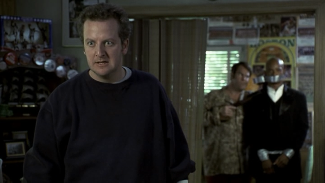 The next morning, Flaherty and O’Hara wake up, shocked to find Scott in O’Hara’s house. They then decide to take some incriminating photos with him wearing Celtics gear before attempting to dump him outside. Scott wakes up before they have a chance to dump him in an alley, and the plans change to become more like a kidnapping. Scott calls out O’Hara as for what he really is: a washed up former high school star. Angry, O’Hara heads out to get some breakfast, though Scott uses the opportunity to try and turn Flaherty against O’Hara, before then berating him for his hobby of collecting sports memorabilia. When O’Hara returns, Flaherty and O’Hara get into a fight, exactly according to Scott’s plan. After talking to their cop friend, O’Hara decides that they need to keep Scott in Flaherty’s home until after the Celtics game against the Jazz, to help the Celtics win. Meanwhile, O’Hara’s soon-to-be-ex and son stop by to drop off some of his belongings, as they think he will live with Flaherty from then on. O’Hara tries to get them out of the apartment, but they manage to find Flaherty and Scott, with Scott tied up and Flaherty holding a gun.