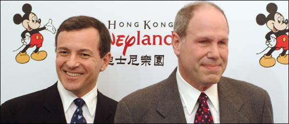 Robert Iger (L), president and COO, and Michael Eisner (R), chairman and CEO, The Walt Disney Co. speak to reporters Sunday, January 12, 2003 during the ground-breaking ceremony for the $2.9 billion Hong Kong Disneyland theme park. Photographer: Grischa Rueschendorf/Bloomberg News