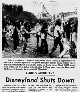 “The youths, who were participating in what was called a Yippie ‘invasion,’ had shouted obscenities and had pulled down red, white and blue bunting hanging near Disneyland’s make believe City Hall.”