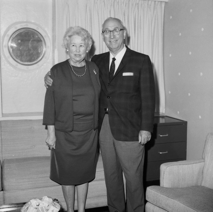 (Original Caption) Mr and Mrs. Roy O. Disney of North Hollywood, Calif. are pictured in their suite aboard the grace lines S.S. Santa Paula, just before sailing at noon today for a thirteen day cruise to South America and the West Indies. Mr. Disney is president of Walt Diwsney Studios in Hollywood, Calif. and the brother of Mr. Walt Disney.