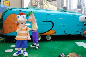 On July 11, 2011, a special event was held in New York City to kick off the cross-country tour of Perry the Platy-Bus, a promotional bus designed to look like Phineas and Ferb character Perry the Platypus. Celebrating, and promoting, the upcoming television movie Phineas and Ferb: Across the 2nd Dimension, the bus would make its way from New York to Comic-Con in San Diego. In attendance in New York to wish the bus well on its journey were Phineas and Ferb creators Dan Povenmire and Jeff “Swampy” Marsh, voice of Perry the Platypus Dee Bradley Baker, and voice of Isabella Alyson Stoner.