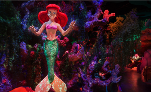 On June 3, 2011, the dark ride attraction The Little Mermaid: Ariel’s Undersea Adventure opened in Disney California Adventure Park. Guests board a clamshell version of the Omnimover and head “under the sea” to explore musical scenes from the popular animated feature film, including versions of “Poor Unfortunate Souls” and “Kiss the Girl.” A version of this attraction opened in Walt Disney World’s New Fantasyland expansion on December 6, 2012.