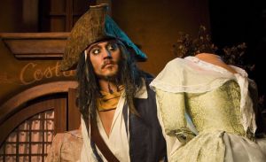On July 7, 2006, the popular attraction Pirates of the Caribbean reopened after an extensive refurbishment that added an audio-animatronic figures of the character Jack Sparrow from the franchise of the same name. The reopening of the attraction coincided with the release of the second film in the series, Pirates of the Caribbean: Dead Man’s Chest. Jack Sparrow appears in a few scenes within the attraction, including hiding behind a dressmaker’s dummy, peering out of a barrel, and celebrating his good fortune after finding and collecting treasure.