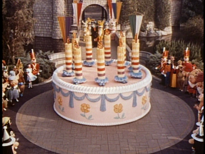 “All the characters of the Magic Kingdom are gathering for the tenth anniversary celebration,” Walt narrates, as toy soldiers begin marching down the castle walkway, followed by a host of Disney characters. Mary Poppins, the newest member of the Disney family, makes a surprise visit, and after a quick dance number, she flies away again. “From now on,” Walt declares, “no Disneyland celebration is going to be complete without Mary Poppins.” Singing a song celebrating the Tencennial, a magic dancing cake and candles open the parade down Main Street, which leads off with children from Anaheim schools in their marching bands and dance troupes.