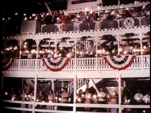 The Mark Twain Riverboat stops by, with jazz music playing merrily from inside. She sails down the river, with guests and enjoying the entertainment, while the waiters dance. Louis Armstrong then sings a song for the crowd, before being given his horn to play. Armstrong reminisces with Kid Ory and Johnny St. Cyr before launching into another tune, much to the audience’s delight. Meanwhile, Walt is still signing, this time at the Plaza Gardens, where the place is “jumping” as he puts it. The main girl comes back with several hats for him to sign, but brings him a hat just for him to wear as thanks. At the Plaza Gardens, the Osmond Brothers are brought to the stage to sing for the audience. After their performance, the audience gets up to dance once again. After dancing, they bring out vocalist Tony Perez and they have the audience sing along with him. Walt greets the audience one last time, wishing them goodnight before leaving to get ready for the morning – his other favorite time of day at Disneyland.